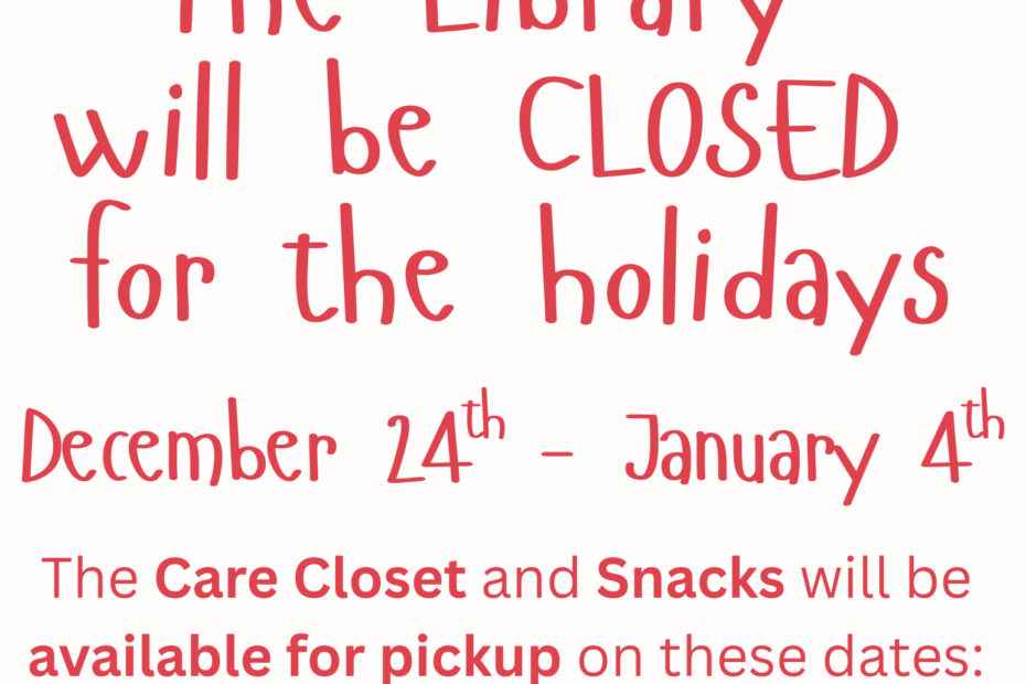 The library will be CLOSED for the holidays from Wednesday, December 24th, 2025 to Sunday, January 4th, 2026.